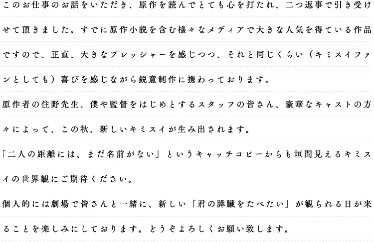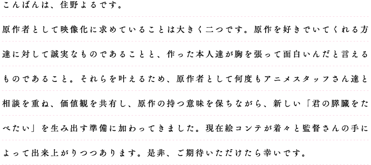 そして、作者としての嬉しさがあります。『君の膵臓をたべたい』はまぎれもなく読者さんが世に送り出し、育ててきてくれたお話です。そのアニメの曲を、読者さんを通じて知ったsumikaの皆さんが作ってくださることは、『君の膵臓をたべたい』という本へのクライマックスとして、これ以上なく素敵なことだと感じています。 - 牛嶋新一郎監督コメント