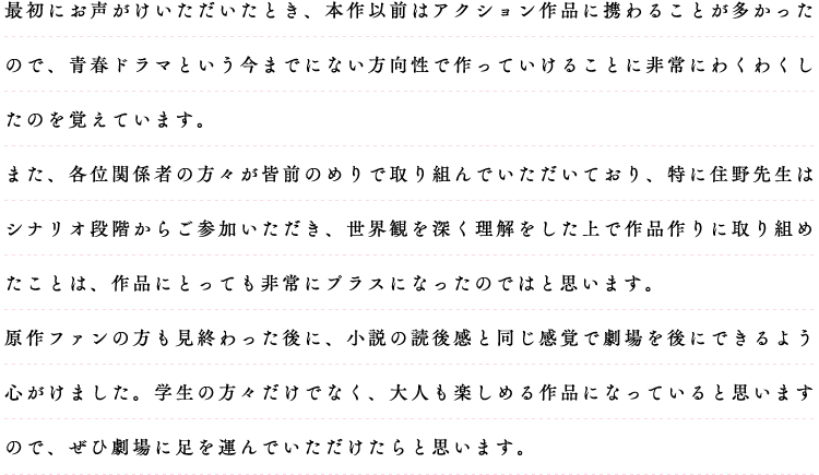 素晴らしい原作があって、そこにリスペクトを持った制作チームと共に、化学変化を楽しみながら、作品を作り上げました。一ファンとしても完成を心から楽しみにしております。 - 住野よる先生コメント