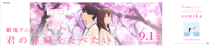 8月1日(水)~14日(火)の期間に渋谷駅前・ハチ公広場にて、劇場アニメ「君の膵臓をたべたい」と、sumikaの8/29発売「ファンファーレ/春夏秋冬」CDジャケットアートワークを使った巨大ボードが展開となります!